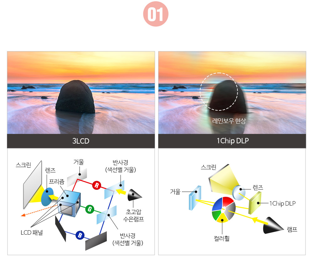3LCD 기술적용으로 밝고 컬러풀한 이미지를 위한 하이컬러 재현이 가능합니다. DLP에 비해 컬러 표현력이 월등하게 높으며 고해상도의 이미지를 부드럽고 선명한 영상으로 시청할 수 있는 장점이 있습니다.