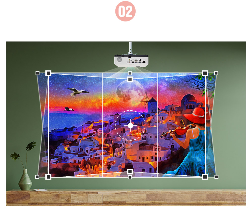 투사된 이미지가 왜곡되었을 경우 좌측상단, 우측상단, 중앙상단, 중앙하단, 좌측하단, 우측하단 6개의 포인트를 사용자가 직접 조정하여 영상의 왜곡 없이 정확하고 최적화된 화면을 구현할 수 있습니다.