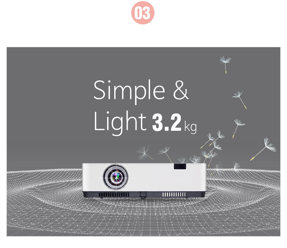 3.2kg의 가벼운 무게로 휴대가 용이해 이동이 필요한 프레젠테이션에도 사용가능하며, 심플한 화이트 바디는 어느 공간에 설치해도 인테리어를 해치지 않으며 깔끔한 설치 환경을 자랑합니다.