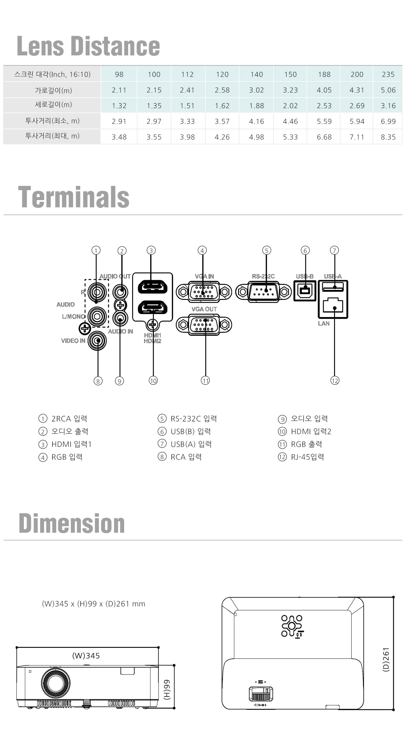 | 입력단자 | 2 X HDMI 1 X RCA 1 X 2RCA(L/R) 1 X 15pin D-sub(RGB) 1 X Φ3.5 jack(Audio) |