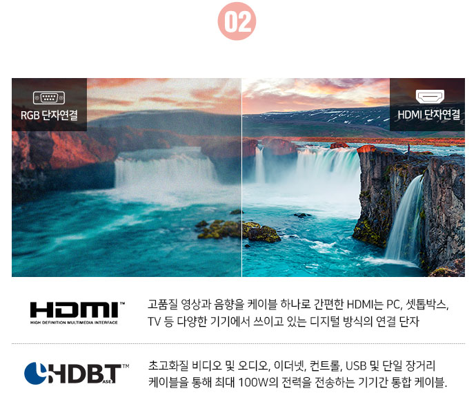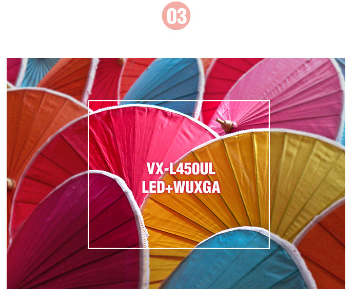 화면 크기가 커질수록 선명한 이미지 표현을 위해서는 해상도가 그만큼 높아야 하는데 저해상도 프로젝터는 보정을 위해 비율을 변경하게 되면 이미지의 화질이 떨어집니다. WUXGA 고해상도의 모델로 HLD LED의 기술로, 정교하고 섬세한 이미지까지 밝고 선명한 영상으로 보여줍니다.