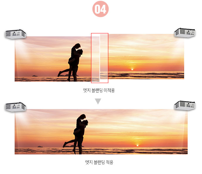 프로젝터에 내장된 엣지 블랜딩 기능으로 두 대 이상의 프로젝터를 하나의 이미지로 투사하여 고해상도의 대형 화면으로 표현할 수 있습니다. (* 엣지블랜딩 : 화면 투사시 중첩되는 부분의 밝기를 조정하여 한 화면처럼 보이게 하는 기능)