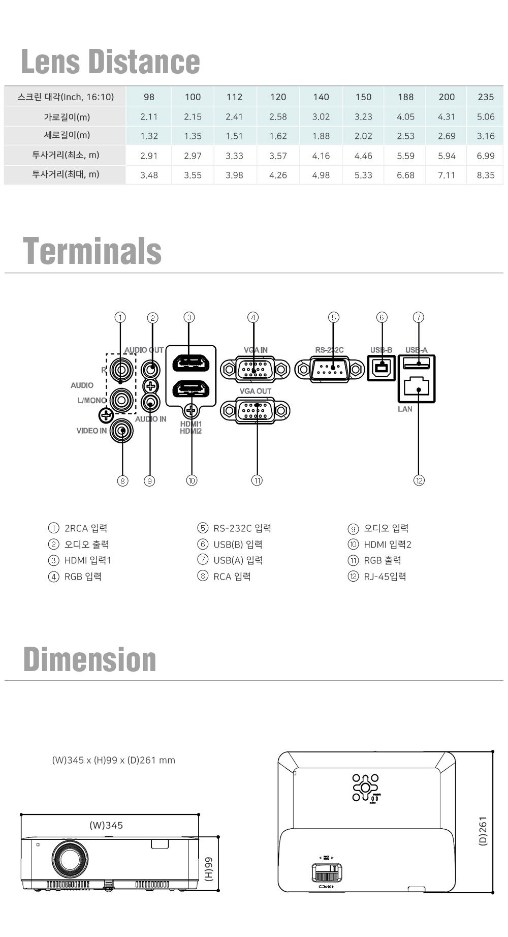 | 입력단자 | 2 X HDMI 1 X RCA 1 X 2RCA(L/R) 1 X 15pin D-sub(RGB) 1 X Φ3.5 jack(Audio) | 출력단자 | 1 X 15pin D-sub(RGB) 1 X Φ3.5 jack(Audio) |