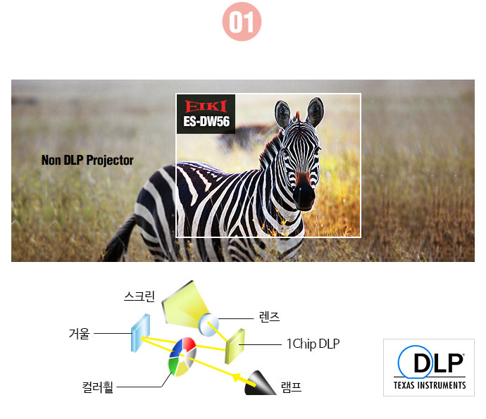 DLP 프로젝터는 화면 중앙부와 주변부 색 밝기의 균일성이 우수하고 높은 명암비를 지닌 특성 때문에 영화 감상이나 생생한 화면 표현에 적합합니다. LCD 방식보다 흑백의 표현력이 좋아 섬세한 주름까지 구분이 될 정도로 리얼합니다.