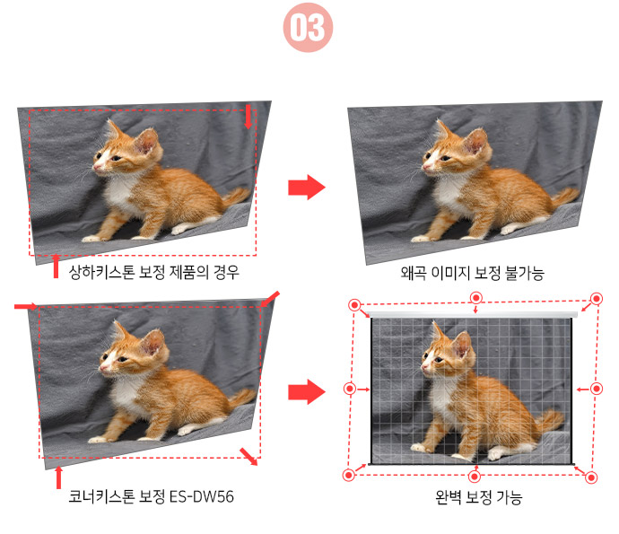 투사 위치에 따라 화면이 기울어져 생기는 이미지 왜곡을 바른 화면 비율로 보정해 주어 프로젝터가 중앙에 위치하지 않아도 왜곡없이 투사가 가능하여 다양한 공간에서의 활용이 자유롭습니다. 코너(모서리)를 직접 조정하여 보다 더 정확한 이미지 보정이 가능합니다.