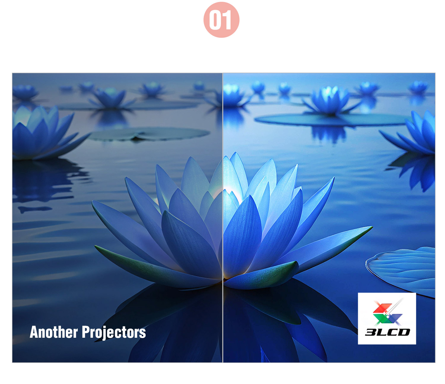 3LCD 기술적용으로 밝고 컬러풀한 이미지를 위한 하이컬러 재현이 가능합니다. DLP에 비해 컬러 표현력이 월등하게 높으며 고해상도의 이미지를 부드럽고 선명한 영상으로 시청할 수 있는 장점이 있습니다.