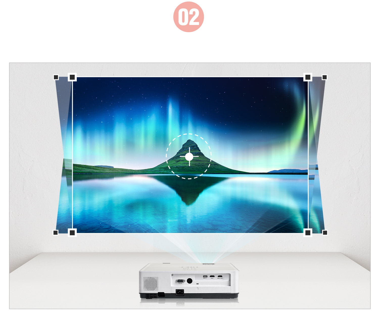 투사 위치에 따라 왜곡 되는 이미지를 프로젝터가 중앙에 위치하지 않아도 영상의 왜곡 없이 반듯하고 정확하게 투사 가능하도록 자동 보정해 주는 코너키스톤 기능으로 안정된 시청 경험을 제공합니다.