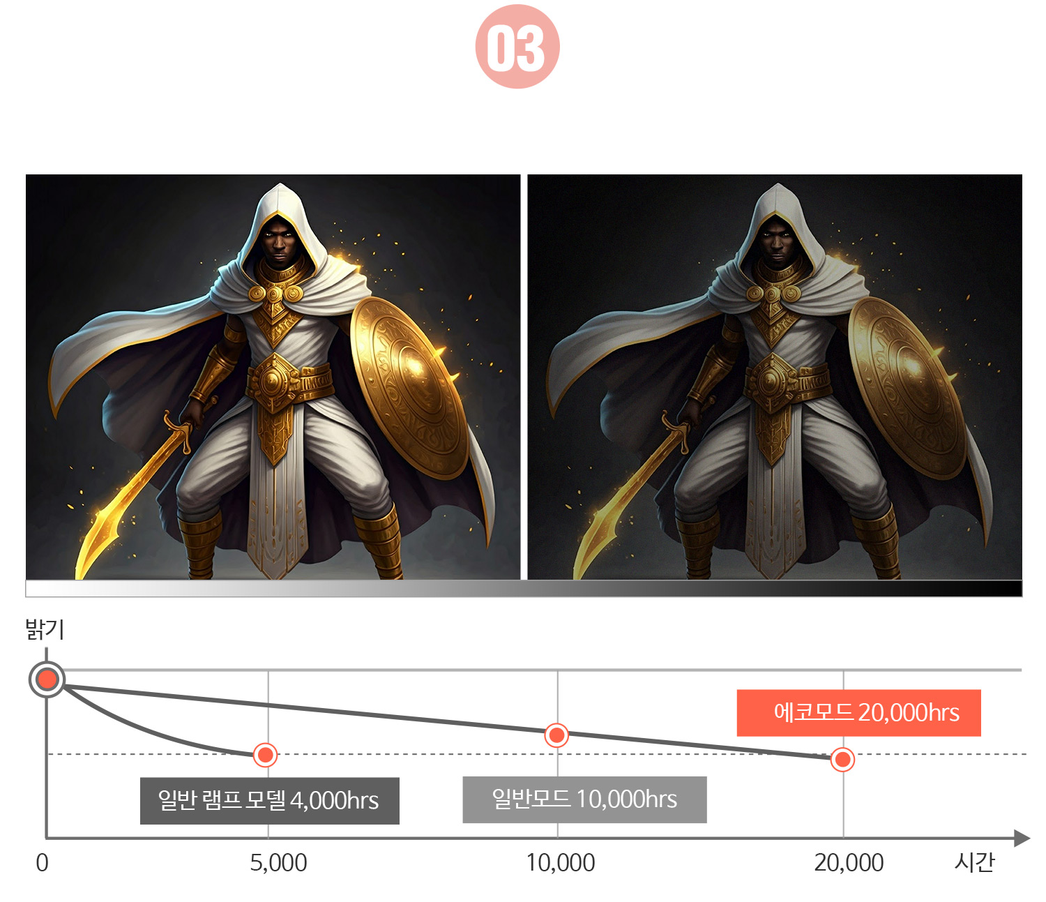 혁신적인 장수명 램프 내장으로 기존 프로젝터보다 최대 2.5배 긴 사용 시간을 제공합니다. 잦은 램프 교체의 번거로움이 없어 유지 관리 및 시간과 비용 절감 효과를 볼 수 있습니다. (※ 자사 기존모델 기준 / 제품의 수명은 사용 환경에 따라 상이합니다.)