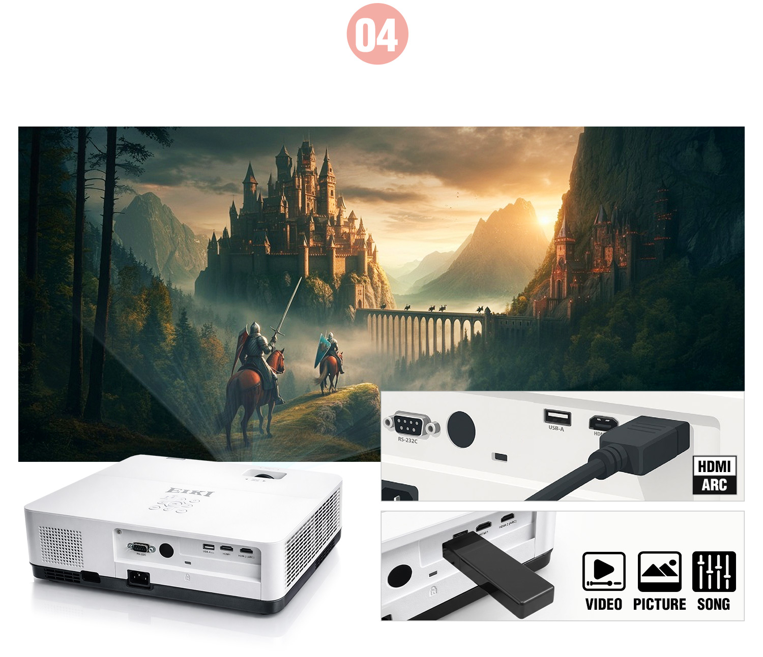 HDMI ARC (Audio Return Chahhel) 는 프로젝터에서 출력되는 오디오를 사운드 바 및 리시버로 직접 전달하여 추가 케이블 없이 하나의 HDMI 연결만으로도 풍부하고 몰입감 있는 사운드를 구현합니다. 또한 USB 연결만으로 비디오, 사진, 음악 등을 바로 재생할 수 있어 편리합니다.