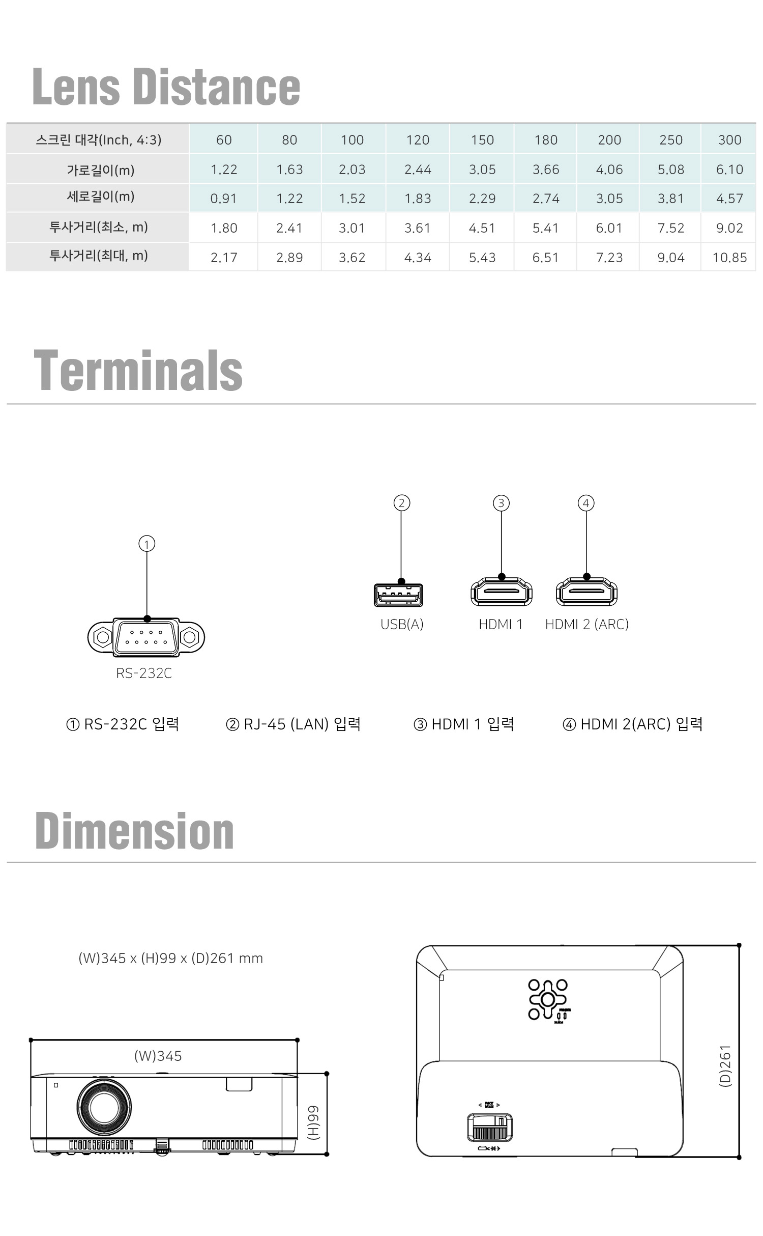 | 화면사이즈 | 30 ~ 300" | 램프 타입 | 225W |