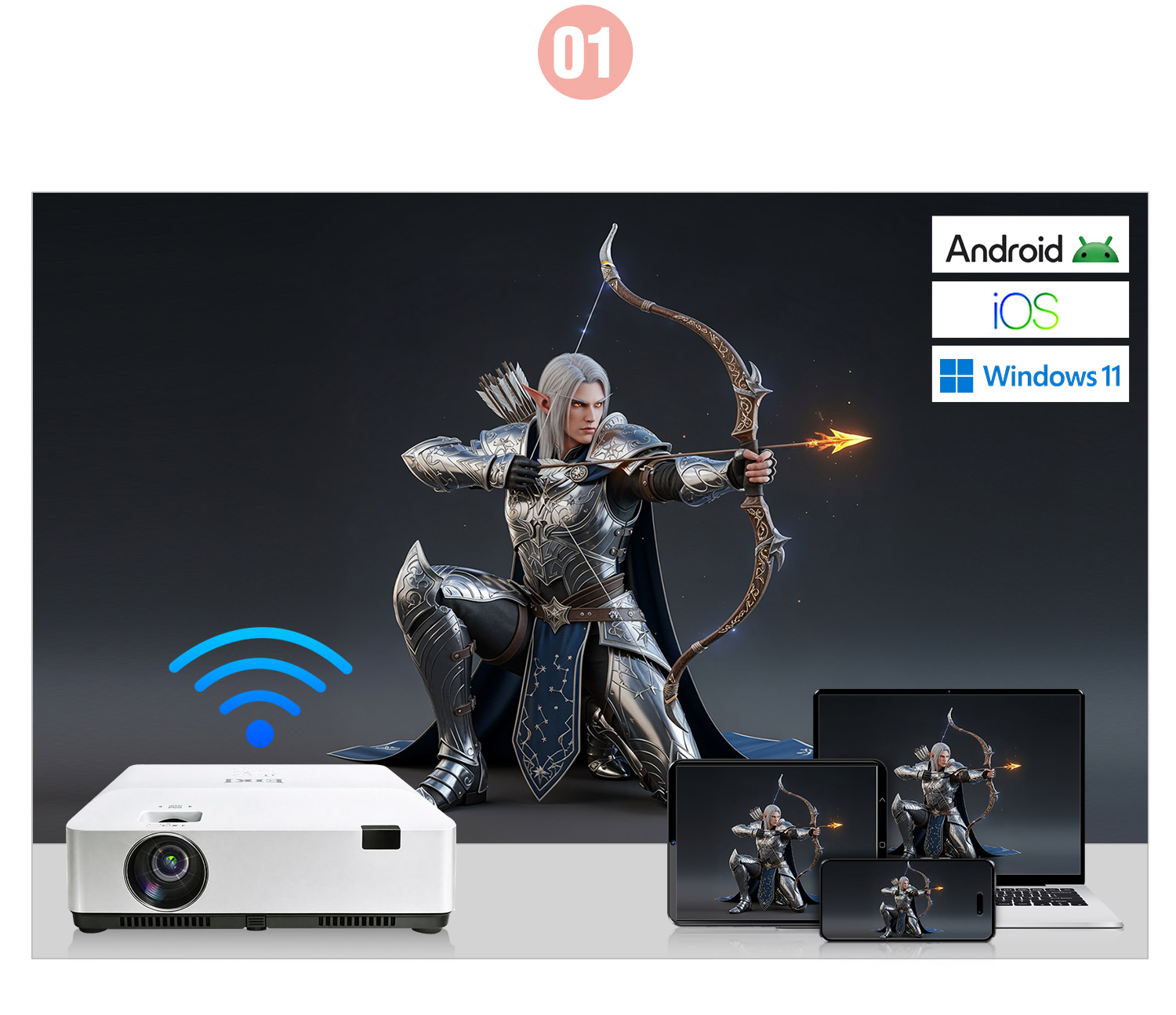 내장된 네트워크 기능을 통해 노트북, 태블릿, 스마트폰 등의 화면을 무선으로 투사할 수 있습니다. 별도의 케이블 연결 없이도 빠르고 안정적으로 화면을 공유하여 회의, 프레젠이션, 영상 감상 등 다양한 활용이 가능합니다.
