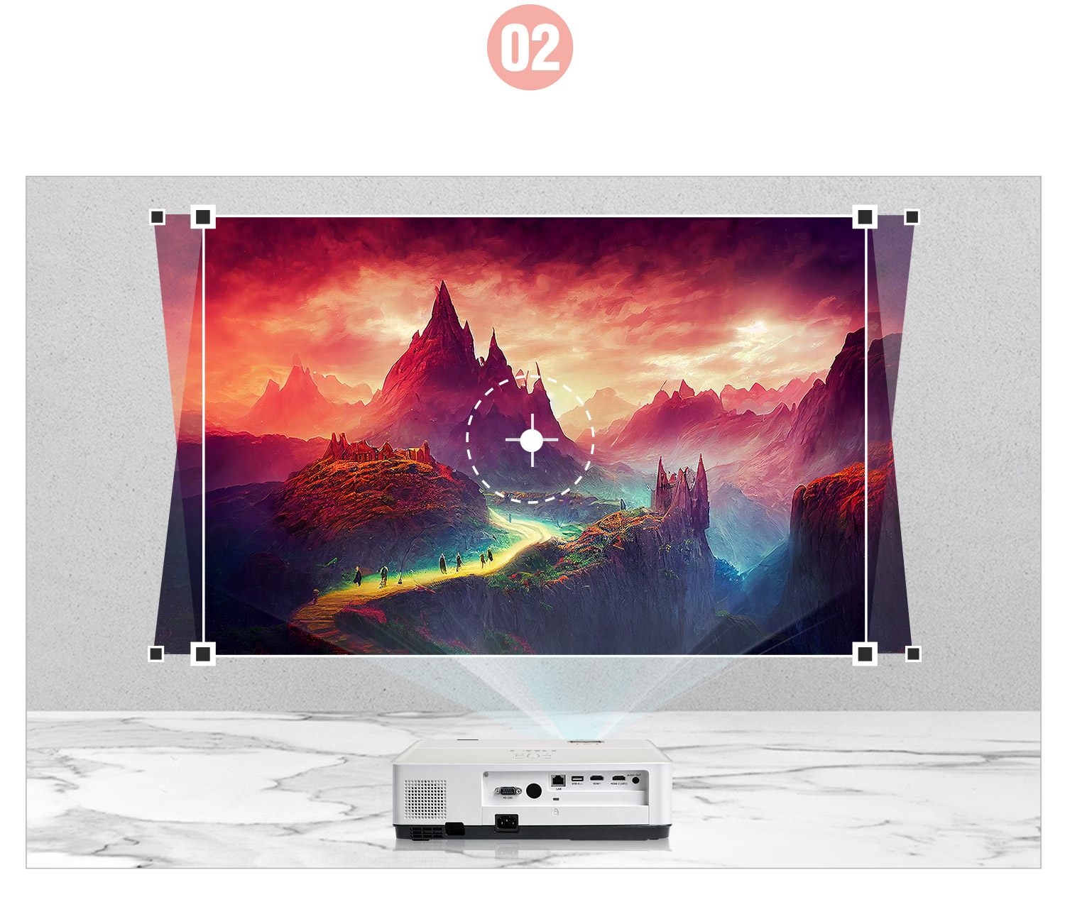 투사 위치에 따라 왜곡 되는 이미지를 프로젝터가 중앙에 위치하지 않아도 영상의 왜곡 없이 반듯하고 정확하게 투사 가능하도록 자동 보정해 주는 코너키스톤 기능으로 안정된 시청 경험을 제공합니다.