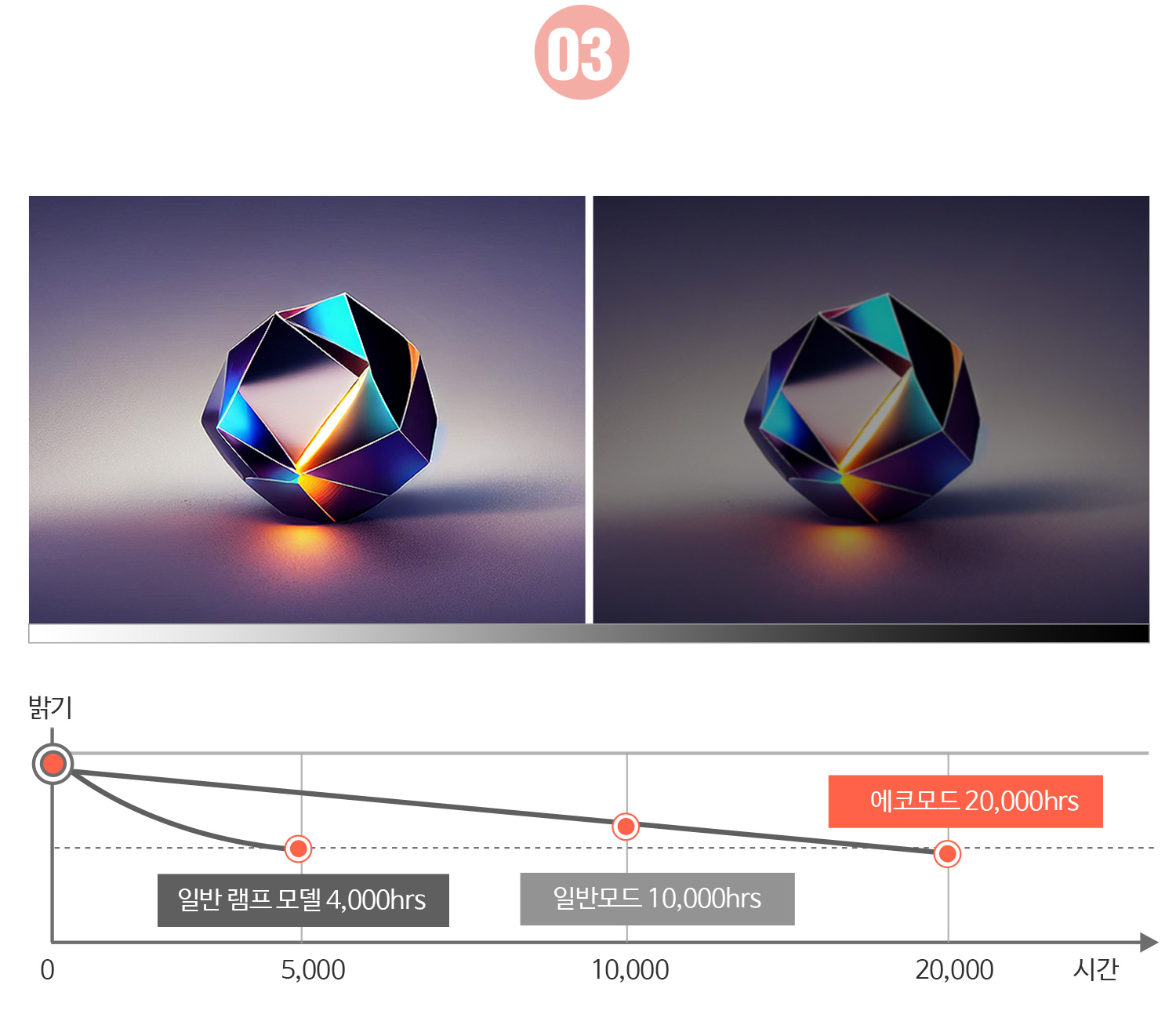 혁신적인 장수명 램프 내장으로 기존 프로젝터보다 최대 2.5배 긴 사용 시간을 제공합니다. 잦은 램프 교체의 번거로움이 없어 유지 관리 및 시간과 비용 절감 효과를 볼 수 있습니다. (※ 자사 기존모델 기준 / 제품의 수명은 사용 환경에 따라 상이합니다.)